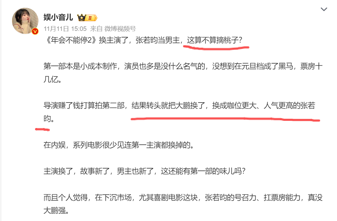 先说结论,《年会不能停!2》确实经历了资本巨震,在利益驱动下变化很大,但要说张若昀抢了大鹏的主角位置,还真不是这么回事儿。