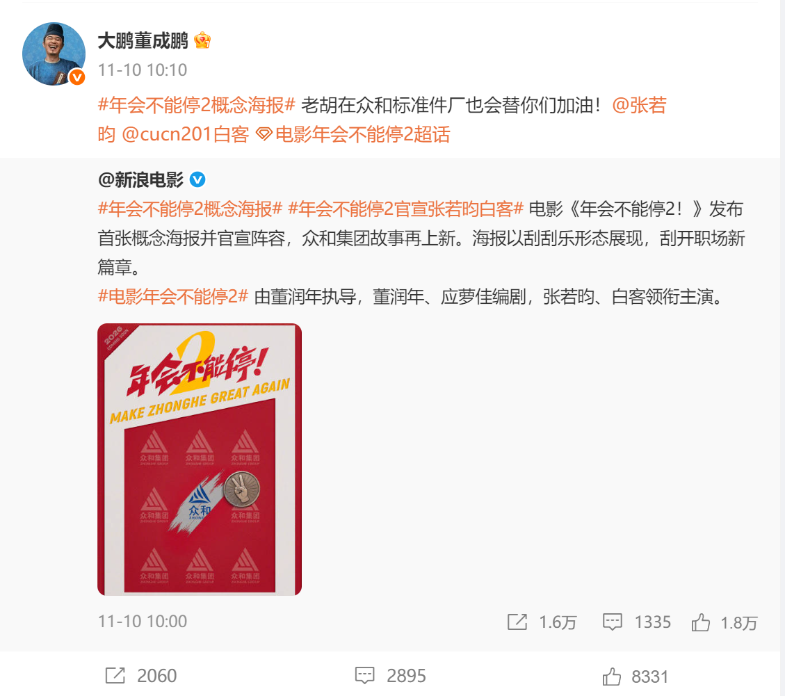 原本《年会不能停!2》的概念海报和阵容发布是11月10日的事儿,滞后上热搜源于三重buff叠加: