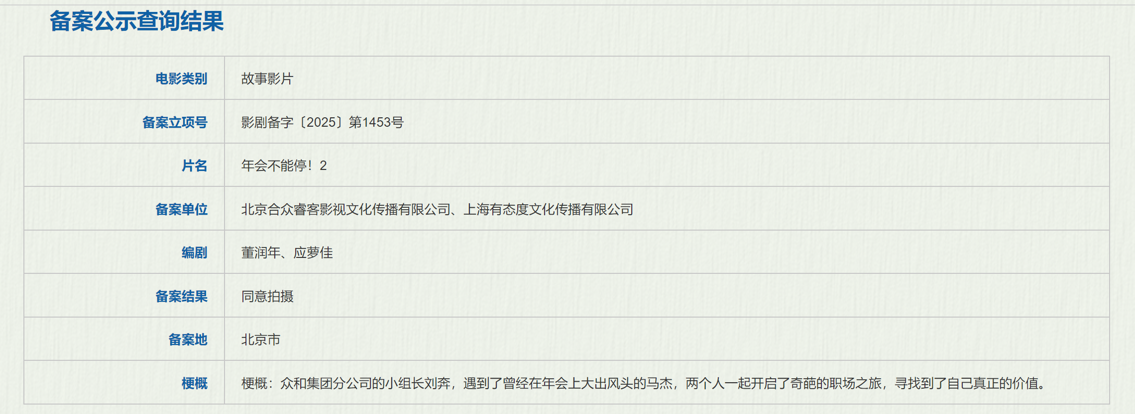 这一点早在《年会不能停!2》备案公示就有了答案了。备案单位不是上部主控公司嘉映,而是应萝佳担任法人的合众睿客和有态度文化,不出意外,这两家将是续集的第一、第二出品方。至于有没有嘉映很难说,就算有,应该也是往后排了。到了续集,董润年和应萝佳掌握了足够的话语权。