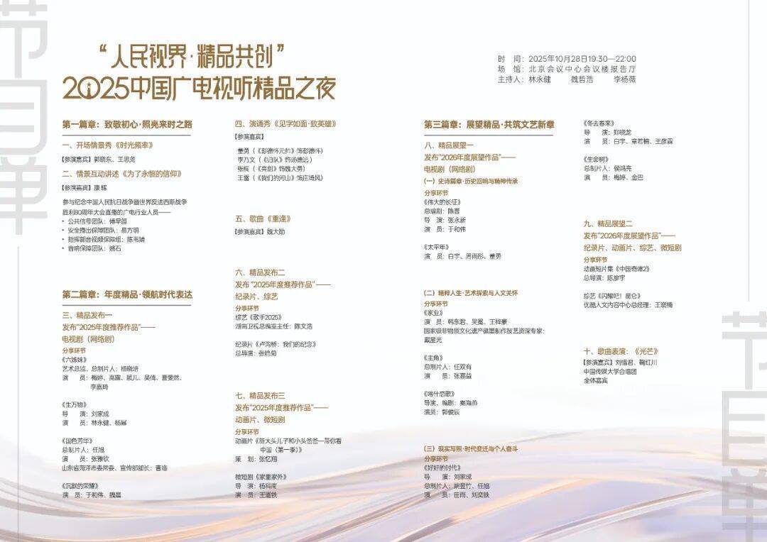 晚会核心环节之一,是揭晓“2025年度推荐作品”与“2026年度展望作品”两大片单,展现中国广电视听精品创作的蓬勃格局。